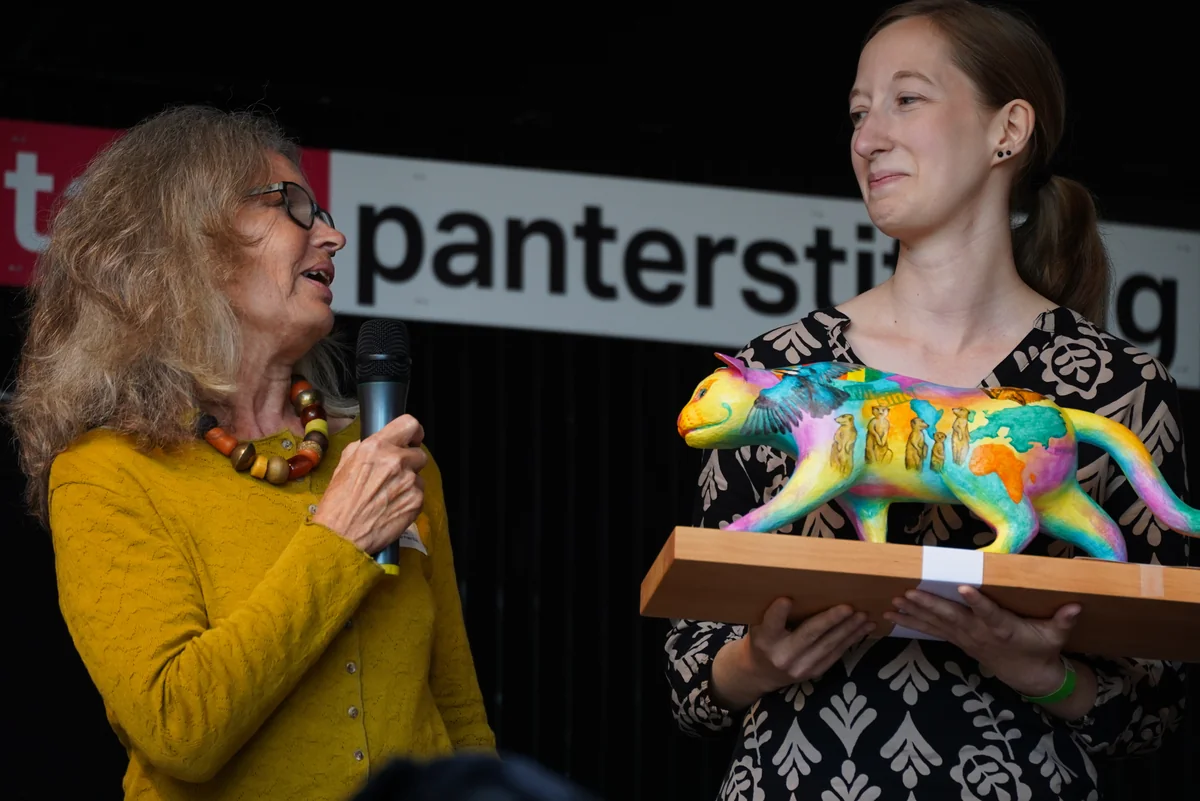 Die Gruppe, für die sich die Leser:innen entschieden hätten, sei schon besonders lange aktiv. „Ich freue mich, den taz Panter Preis 2025 zu übergeben – an das Bündnis Kaiserslautern gegen Rechts", sagt Schmitter. Kurz darauf halten Christina Freunscht und Zora Tischer den bunten Panter unter dem Beifall des Publikums und der drei anderen Initiativen in die Höhe.