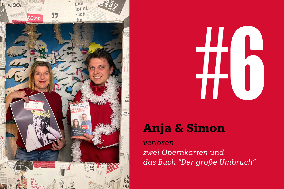 Anja Mierel und Simon Bozic aus taz Marketing, Kommunikation und Kreation kamen, sahen und verlosten.