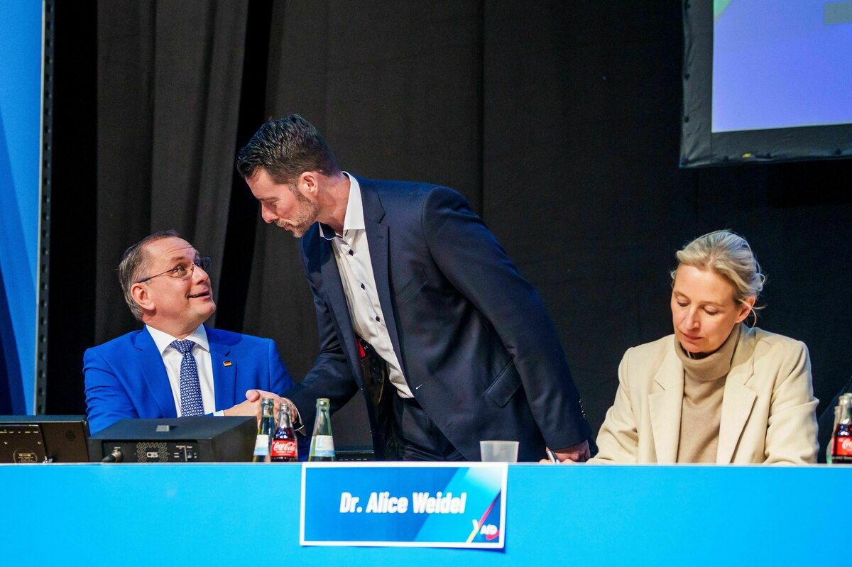 Mit ungefähr einer Stunde Verzögerung sind die AfD-Chefs Alice Weidel und Tino Chrupalla beim Gründungskongress der neuen AfD-Jugendorganisation in Gießen angekommen. Angereist ist auch Thüringens Parteichef Björn Höcke. (dpa)