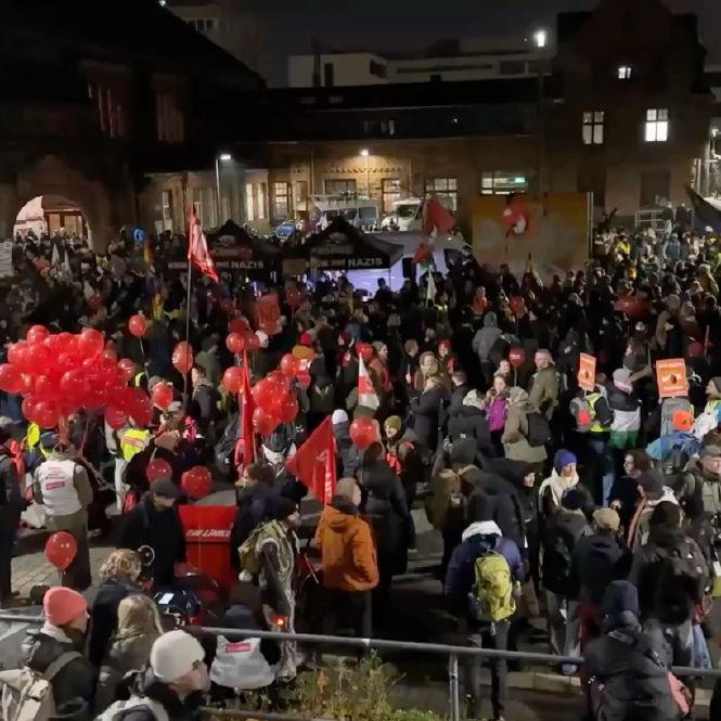 Warum stehen Menschen freiwillig so früh auf und harren in der Kälte aus? Mehrere Schülerinnen einer 11. Klasse aus Berlin Kreuzberg, die im "pinken Finger" dabei sind, sagen der taz dazu: "Wir sind hier, weil die Junge Alternative als gesichert rechtsextrem eingestuft wurde und die neue AfD-Jugend voraussichtlich nicht gemäßigter sein wird", sagt Ricci. "Wir sind die Generation die mit den Folgen des Rechtsrucks leben muss, deshalb stellen wir uns dem jetzt entgegen", sagt die 16-Jährige. Ihre Eltern seien vorab zunächst besorgt gewesen, etwa über Polizeigewalt, dann aber Brote für sie geschmiert. "Ich habe keine Angst, hier in der Blockade kümmern sich alle umeinander, das ist ganz toll". (jw)