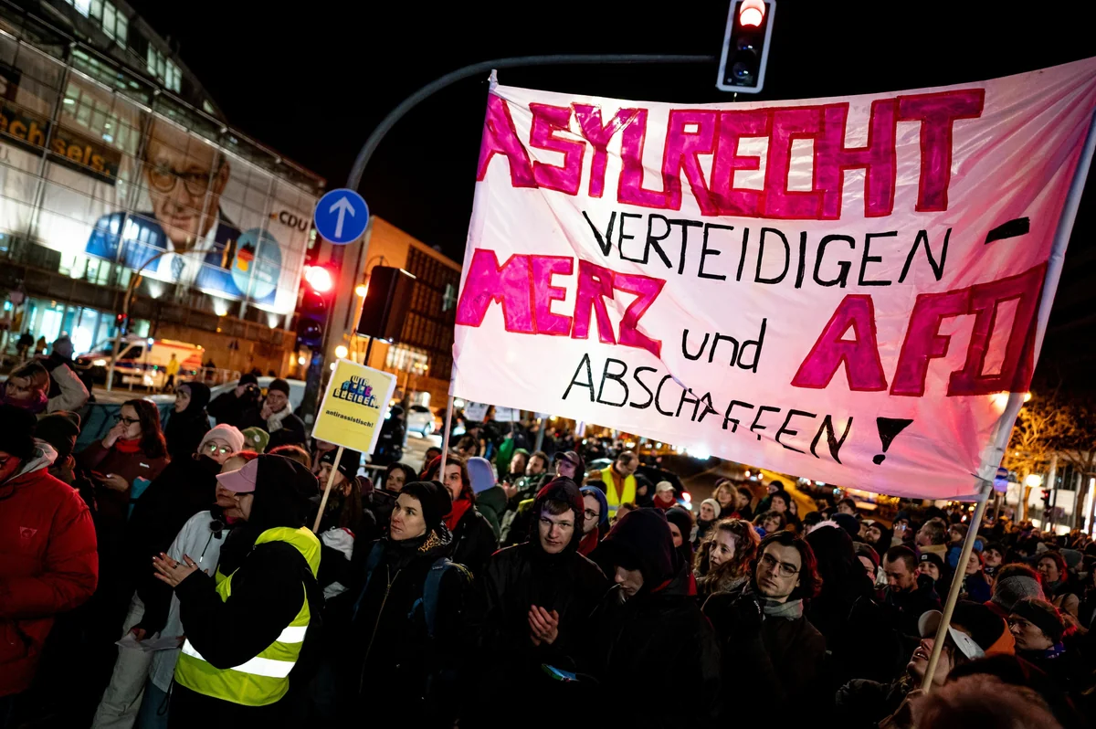 Bislang protestieren nach Merz' Tabubruch rund 1.000 Leute vor der CDU-Parteizentrale. Die Polizei hat weiträumig abgesperrt. Vor dem Konrad-Adenauer-Haus bellen Schäferhunde. An der Laterne davor hängt passenderweise ein AfD-Plakat. „Zeit für die neue Volkspartei“ steht darauf. Die Polizei droht, einen Teil der Kreuzung freizuräumen. (gjo)