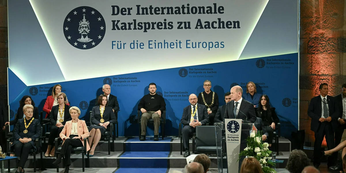 In Aachen bekommt der ukrainische Präsident Selenski den Karlspreis. Europa habe ihm und dem ukrainischen Volk „sehr viel zu verdanken“, sagt Kanzler Scholz.