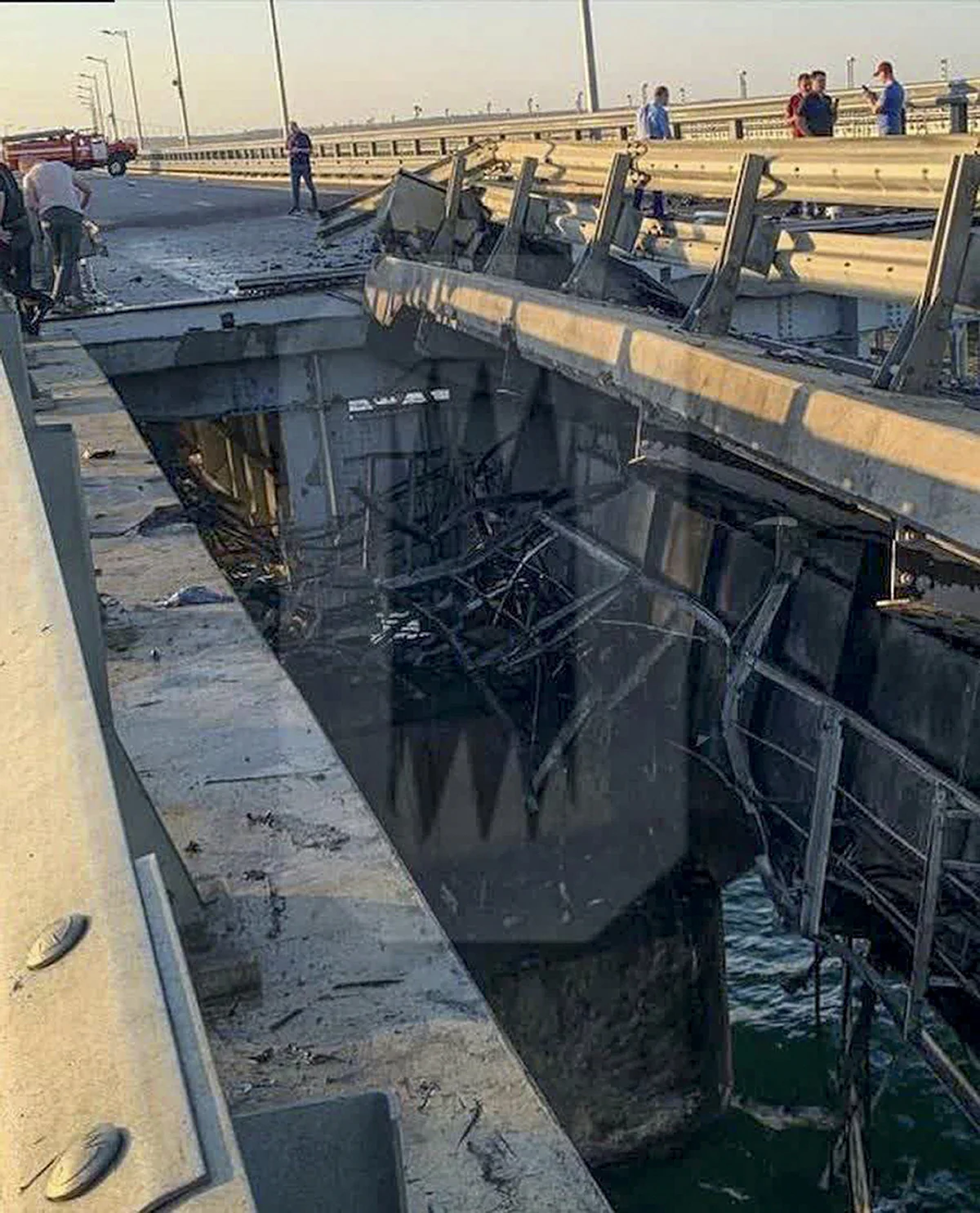 Laut der russischen Regierung starb durch die Explosionen ein Paar. Die 14-jährige Tochter sei verletzt worden. Der Gouverneur der an die Krim angrenzenden russischen Region Krasnodar, Wenjamin Kondratjew, rief Bewohner der Region auf Telegram auf, die Brücke zu meiden. Falls Menschen auf die Krim fahren wollten, sollten sie die „neuen Regionen Russlands“ nutzen, womit Kondratjew von Russland besetztes ukrainisches Gebiet meinte. Auf Fotos ist zu sehen, dass Teile der Brücke abgesunken sind.