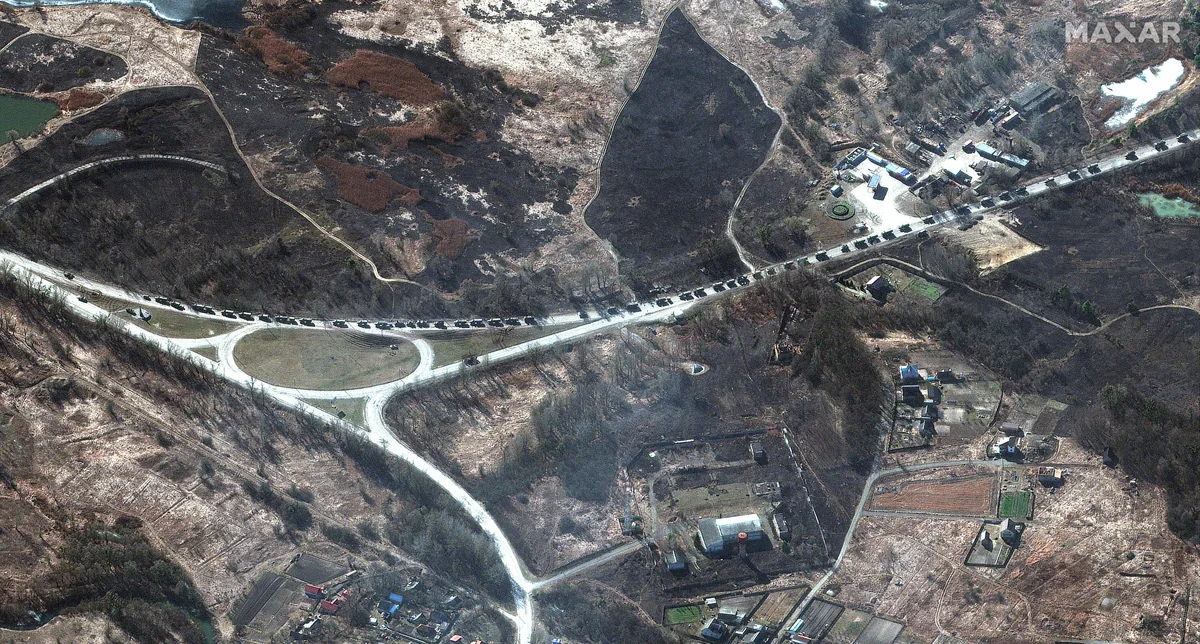 Die Bilder des Konvois zeigen Dutzende Fahrzeuge, die auf Straßen in der ukrainischen Landschaft hintereinander aufgereiht sind. Einige der Fahrzeuge stünden „sehr weit voneinander entfernt“, teilte Maxar weiter mit. Andere seien „zu zweit und dritt“ gruppiert. Auf einigen Bildern sei der Rauch von mutmaßlich brennenden Gebäuden zu erkennen. Das US-Unternehmen veröffentlichte zudem Bilder, die neue Truppenverlegungen von Kampfhubschraubern und Fahrzeugen in Belarus, weniger als 30 Kilometer von der ukrainischen Grenze entfernt, zeigen.