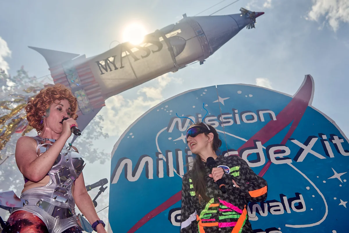 Mittags: „Drei, zwei, eins, Umverteilung!“, rufen einige hundert Menschen aus geeinter Kehle auf dem ehemaligen Johannaplatz, von der diesjährigen MyGruni-Demo liebevoll in Cape Gruneval umbenannt. Dann schon verdunkelt viel Rauch den Himmel, nur leicht flackert noch die Sonne im weit entfernten All durch den Smog der Rakete mit der Aufschrift „MyAss“, kurz für „Antinationales Space Shuttle“, das symbolisch die ersten Superreichen auf ihrem One-Way-Flug zum Mars transportieren soll. Mit dem Themesong von Stanley Kubricks „2001 – A Space Odyssey“ schallt angemessen epochale Musik über den Platz im Villenviertel.