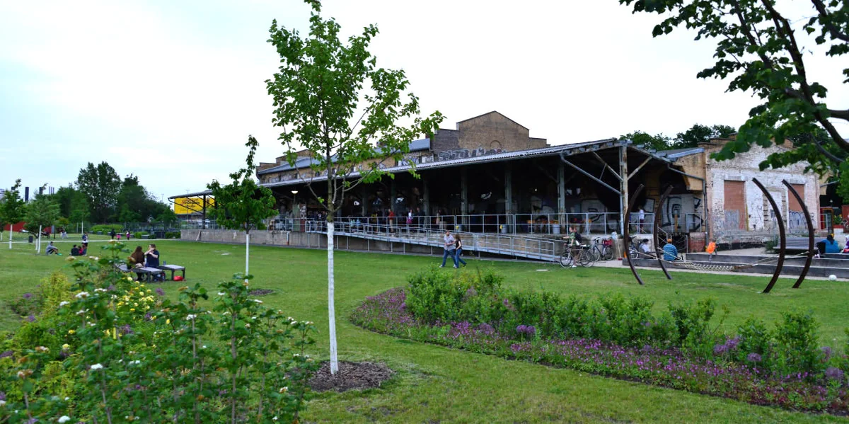 Beim Rundgang durch das Zentrum für Kunst und Urbanistik im ehemaligen Güterbahnhof Moabit ist viel los – der Bauarbeiter von draußen fragt nach Wasser, eine Feier von Künstlern in der großen Haupthalle wird gerade abgebaut und im Bereich der Ateliers für die ausgeschriebenen Residenzen sitzt eine Gruppe von neun Leuten beim gemeinsamen Essen auf der überdachten Terrasse des ehemaligen Bahnsteigs.