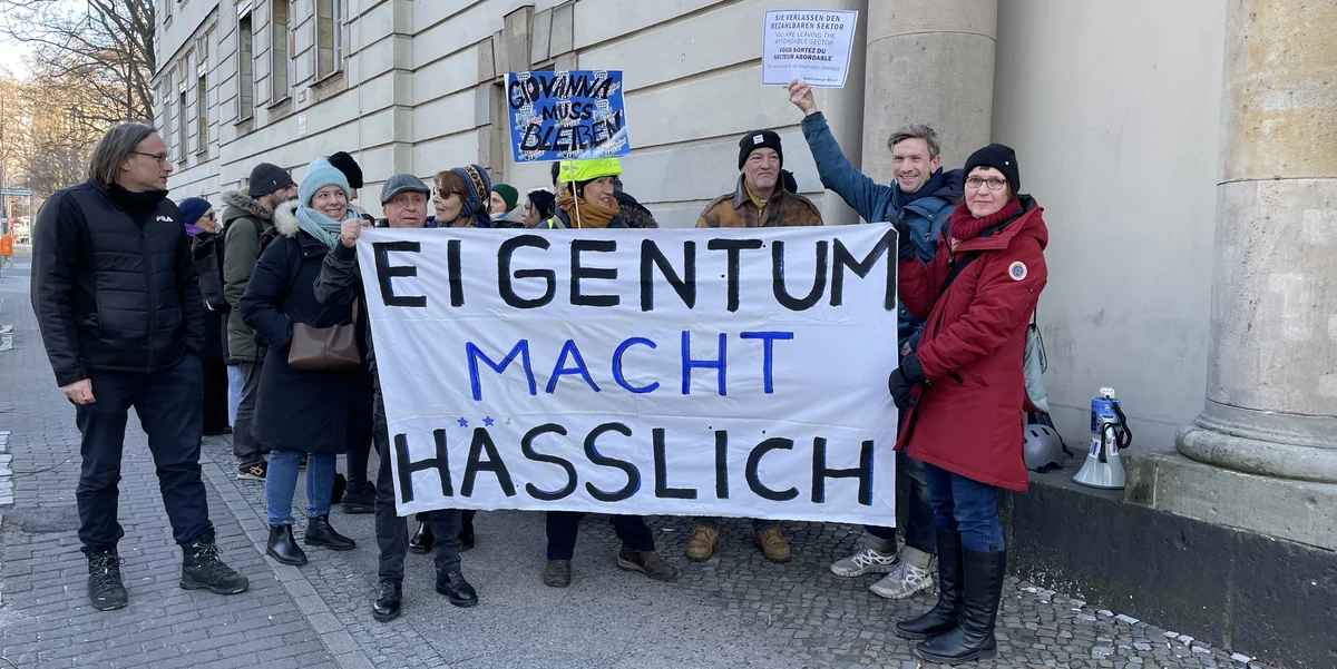 Sie versammelten sich mit einem Transparent und Schildern mit den Schriftzügen „Eigentum macht hässlich“ und „Verrückt nach Eigenbedarf“ vor dem Amtsgericht Kreuzberg. Das Engagement lobt auch die Richterin und gibt zu: „Diese Verhandlungen sind immer ganz schwierig, wir machen das auch nicht so gerne.“