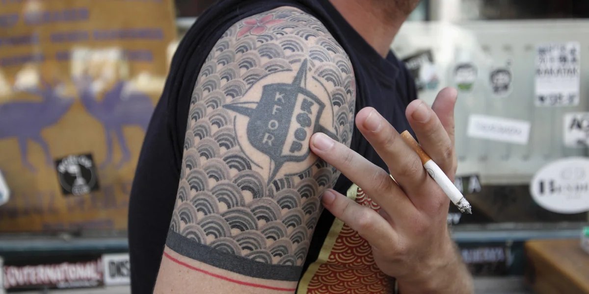 Wouter van Duijn erzählt die Geschichte zu dem Tattoo auf seiner rechten Schulter: „Ich war 1999 als Soldat im Kosovokrieg“, sagt er. Kurz darauf habe er sich das Emblem der KFOR-Soldaten auf den Oberarm stechen lassen. Das mit einem Cover-up zu überdecken kam für ihn aber nicht infrage. Stattdessen hat er sich das Zeichen im Urlaub mit einem wellenartigen Muster umrunden lassen, aus dem zwei rote Blumen herausragen. Seiner Freundin gefällt es: „Eine steht für seine Eltern, die andere für mich“, sagt sie.