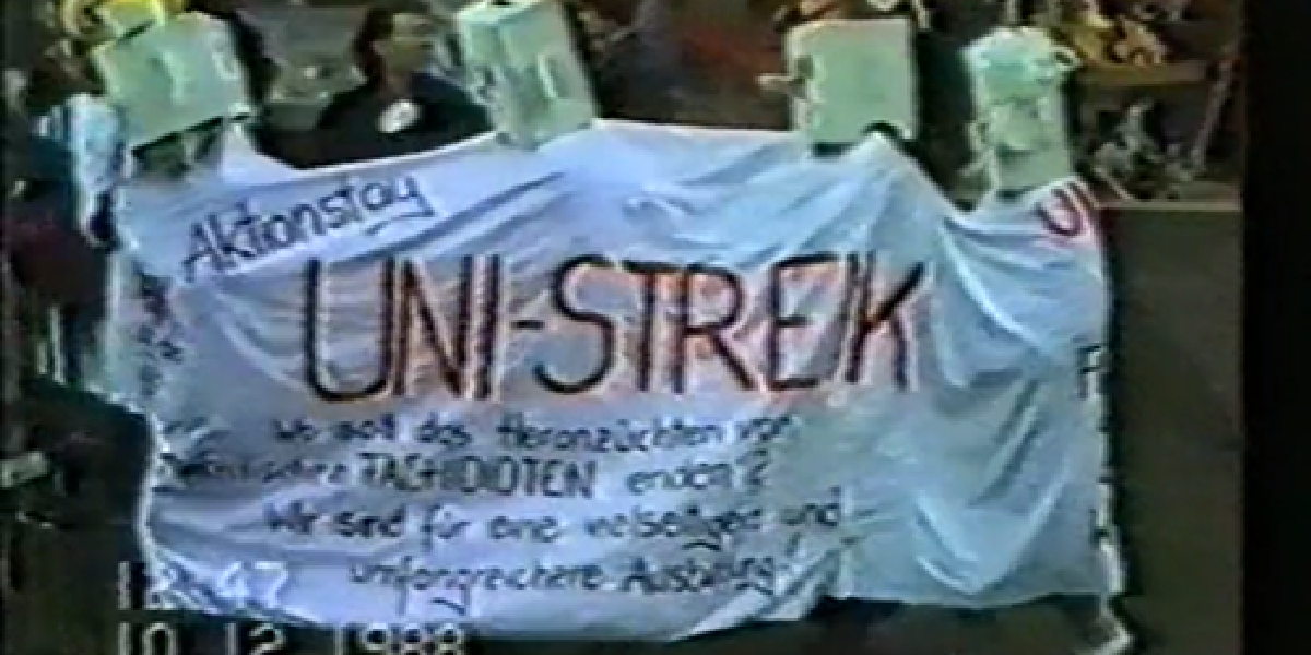 Unter dem Motto “KEINE UNI OHNE UNS“ geht es im Rahmen der letzten Woche von „Interflugs 30: feral methods“ schließlich noch einmal ganz weit zurück, zu den Interflugs-Anfängen: zwei Filme zeigen den Berliner Unistreik aus den Jahren 1988/89 (bis 28. 3.). Am Freitag, den 26. 3., ist letzter Tag für einen Live-Besuch im Archiv (Anmeldung erforderlich) und es kommen noch einmal zwei politische Gruppen zusammen: das kollektiv und maiz.