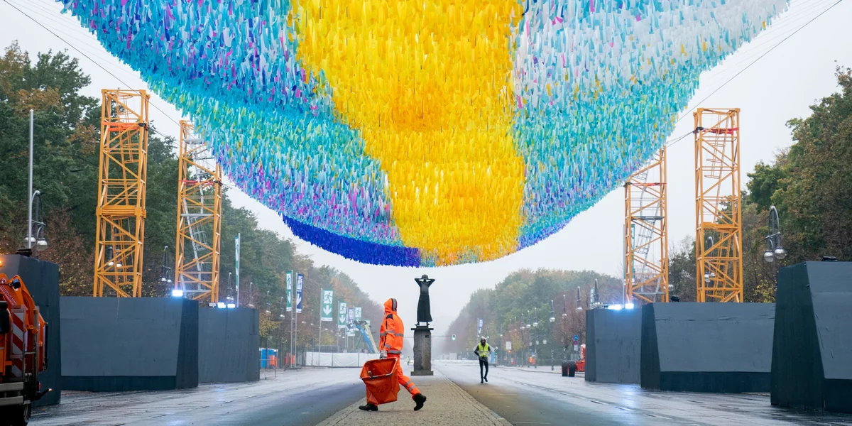 Auf 30.000 der insgesamt 100.000 bunten Stoffstreifen hat der Künstler Patrick Shearn Menschen gebeten, ihre Wünsche und Erinnerungen zum Mauerfall zu notieren. Die Installation erinnert an die flatternde Deko von Gebrauchtwagenhändlern, wie sie Anfang der 1990er Jahre so manche Brache in Berlin schmückte. Oder wahlweise, wenn der Wind durch die Zettel fährt, an einen rauschenden Pappelwald.