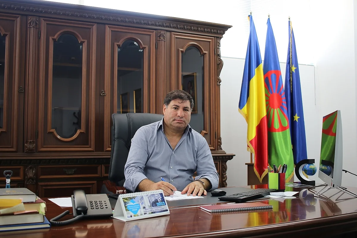 Am nächsten Tag bringt Izabela Tiberiade uns in sein Büro, er hat uns eingeladen. Es liegt in einem imposanten Kuppelgebäude am anderen Ende der Stadt, in das die öffentliche Verwaltung übergangsweise eingezogen ist. Romeo Tiberiade sitzt an einem schweren Holzschreibtisch, hinter ihm eine passende Vitrine. Daneben die rumänische, die Roma- und die Europa-Flagge. An der Wand hängen fünf Ölgemälde. Sie zeigen Frauen in traditionellen Blusen und Röcken, eine mit einem Kopftuch, eine mit einer Geige. „Die Familie“, stellt er vor.