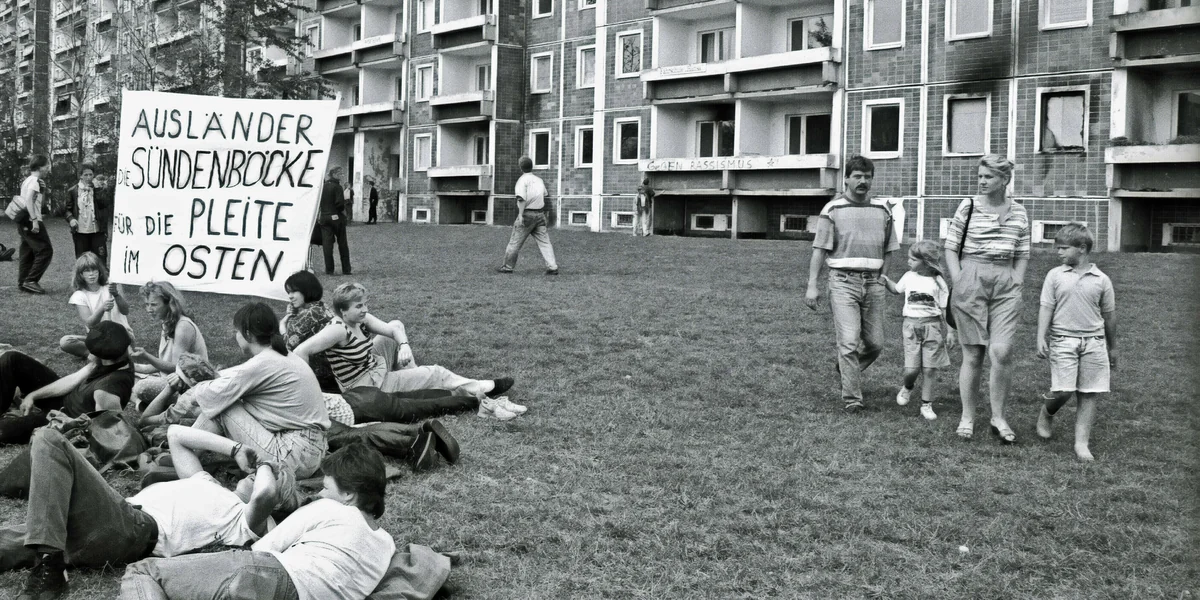 1992 dominieren Debatten zu Ausländer- und Asylpolitik die öffentlichen Diskurse – in West wie Ost. „Die Flut steigt – wann sinkt das Boot?“ oder „Fast jede Minute ein neuer Asylant“, lauten Schlagzeilen der Bild. Die Regierungsparteien CDU und CSU fordern die Einschränkung des Grundrechts auf Asyl. Im Osten treffen diese rassistischen Asyldiskurse auf Transformation und Chaos, auf einen erstarkenden Nationalismus und auf chauvinistische bis rassistische Muster der ehemaligen DDR-Gesellschaft.