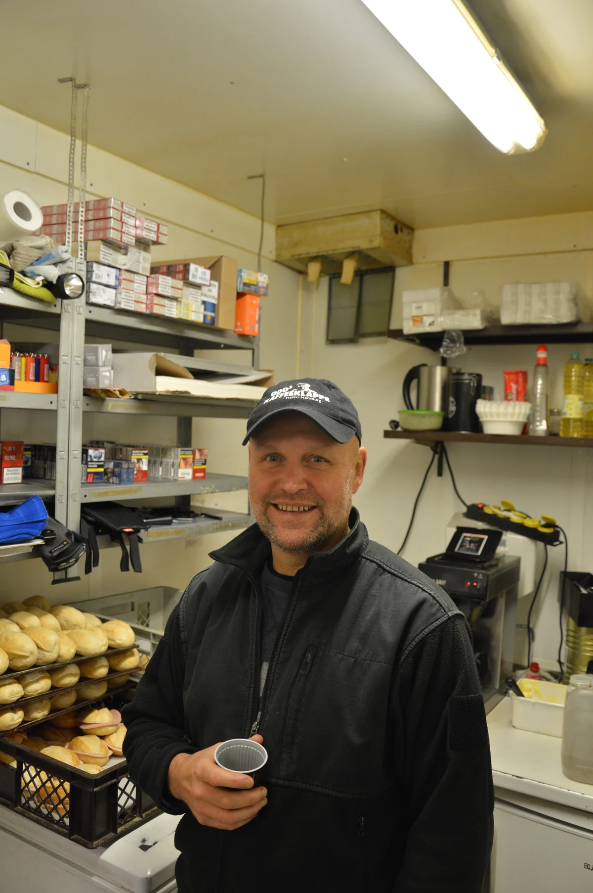 Der Container von Odo misst drei mal sechs Meter. Hier gibt es Brötchen, Kaffee, Kippen, Bier. Ein Kiosk, einerseits. Aber auch ein Ort, der erzählt, wie sich der Hafen in 20 Jahren verändert hat, und dass die Hamburger selbst ein falsches Bild von ihm haben.