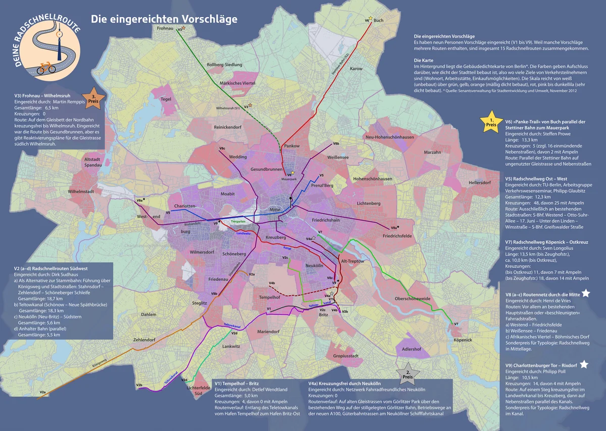 Die drei regulären Preise gingen an Ideen, die sich ungenutzte Gleistrassen oder Begleitwege von Autobahnen zunutze machen: den gut 13 Kilometer langen „Panke-Trail“ zwischen Mauerpark und Buch (teilweise über die alte Stettiner Bahn), die Verbindung Görlitzer Park–Teltowkanal, die unter anderem am derzeit im Bau befindlichen Teilstück der A100 entlangführen würde, und einen Schnellweg auf der Nordbahn zwischen Frohnau und Wilhelmsruh.Letzterer Vorschlag sollte eigentlich bis zur Bornholmer Straße reichen, aber für diesen Trassenabschnitt ist ein künftiger Regionalbahnbetrieb bereitsfest vorgesehen.