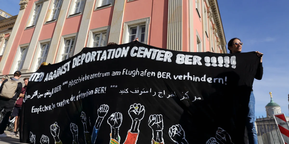 Gut 35 Menschen stehen am Mittwochvormittag vor dem Brandenburger Landtag in Potsdam. „Abschiebezentrum am Flughafen BER verhindern“ prangt in mehreren Sprachen auf einem großen schwarzen Banner. „Wir protestieren gegen eine skandalöse Politik“, sagt Bijan, der eine Ecke des Transparents hält. Dahinter haben sich weitere Demonstrant:innen versammelt.