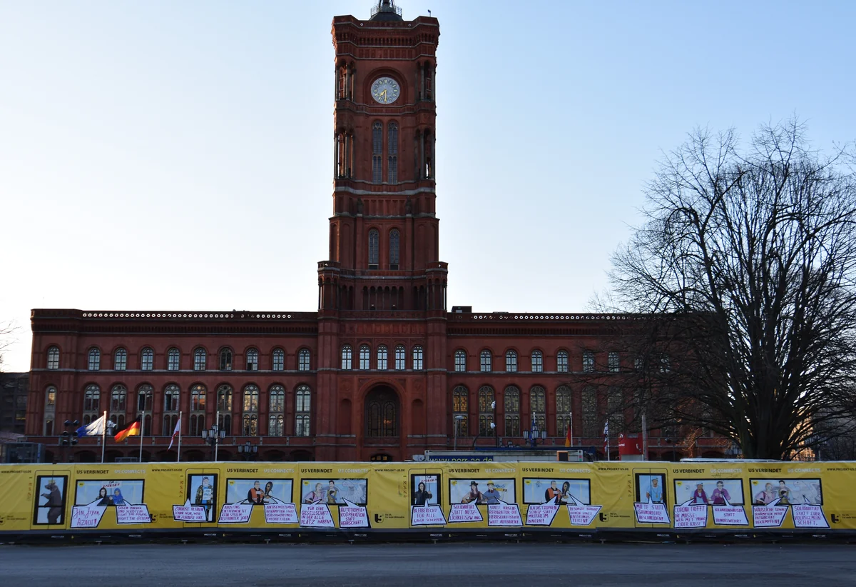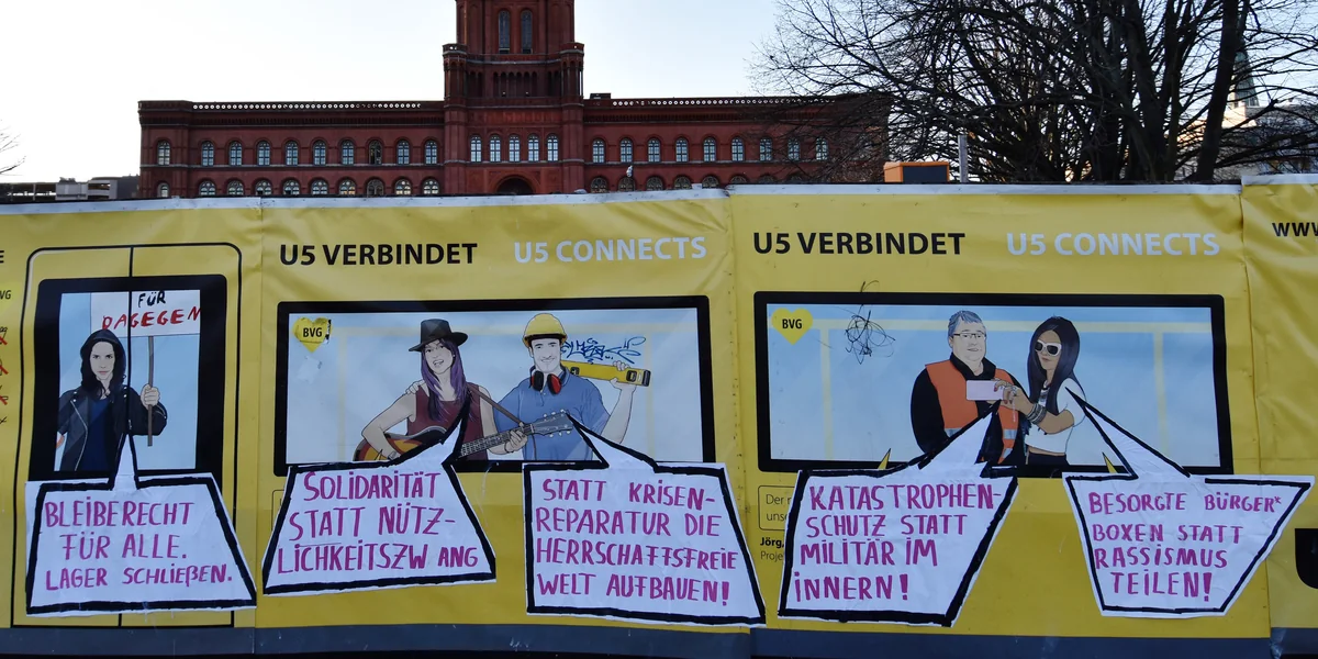 Als Grundlage dafür diente ein Bauzaun der U5-Baustelle vor dem Roten Rathaus, auf dem eine etwa 50 Meter lange BVG-Werbung angebracht ist: eine im Comic-Stil gezeichnete U-Bahn mitsamt Fahrgästen. Ihnen haben die Adbuster:innen in Sprechblasen Kommentare in den Mund gelegt. Die Aktion wirkte so wie eine Versammlung vor dem Rathaus.