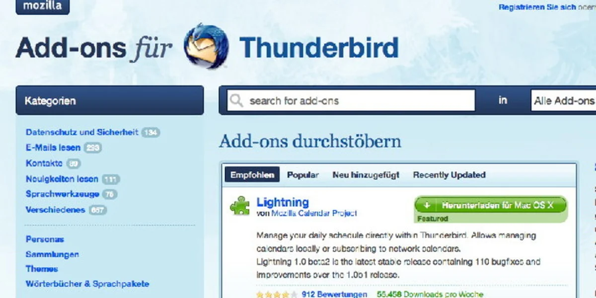 Wer noch mehr Addons will, kann sich jederzeit auf der Homepage der Mozilla-Stiftung mit weiteren versorgen. Aber vorsicht: Es kam bereits vor, dass in den Erweiterungen Sicherheitslücken steckten oder diese gar selbst einen Datenschädling enthielten. Es ist deshalb sinnvoll, vor dem Einsatz Nutzerkommentare und Web-Berichte zu lesen; zudem gilt es, seine Addons stets auf dem neuesten Stand zu halten. Thunderbird bietet dazu ein automatisches Update an.