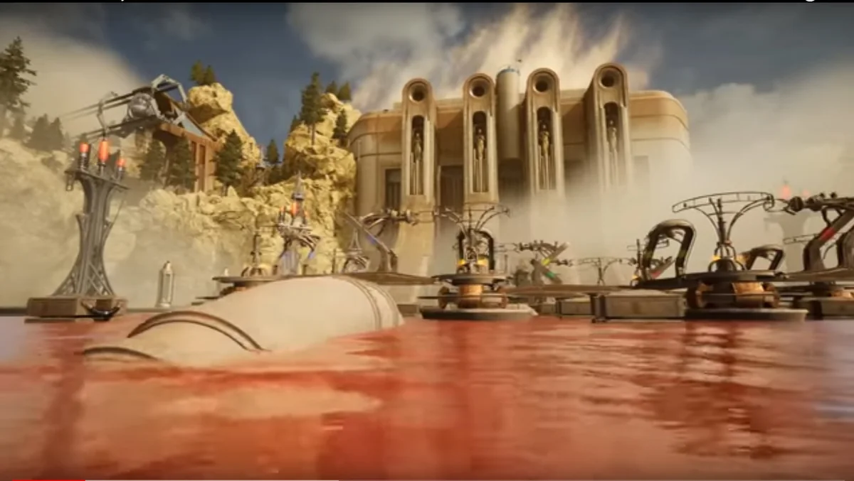 Aus dem Bunker, in dem sie aufwachen, geht's auf einen Gebirgspfad, von dem aus die Spieler:innen erstmals sehen, wie viel mehr man aus einer modernen Grafikkarte rausholen kann. Es gibt drei Rätselwelten: Schneebedeckte Berge, den bewaldeten Boden eines Kraters und eine Lagune. Überall verläuft man sich in steampunk-artigen Infrastrukturmegabauten, irrt man durch Art-Deco-Industriearchitektur. Immer auf der Suche nach dem nächsten Hebel, den die Spieler:innen mit ihrem Werkzeug bedienen können. Das erinnert enorm an die Portal-Gun aus dem gleichnamigen Rätselspiel.