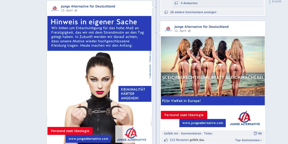 BERLIN taz | Rätselraten über das neue Fotomotiv der Jungen Alternativen (JA), der Jugendorganisation der rechtskonservativen AfD (Alternative für Deutschland), zur Europawahl: Auf Facebook postet der Verband zum Stichwort „Gleichberechtigung statt Gleichmacherei“ fünf nahezu identische weibliche Schönheiten in Tangas von hinten am Strand. Was möchte die Jugend uns damit sagen?