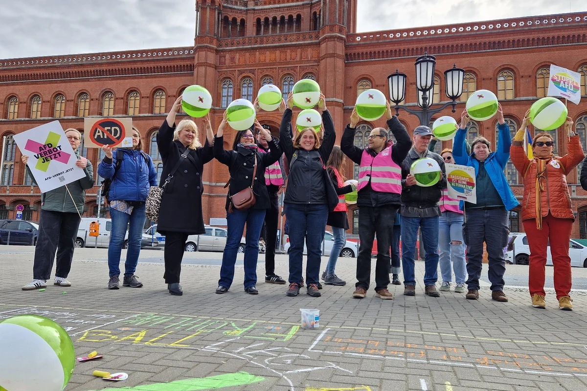 Das Bündnis „AfD-Verbot jetzt!“ hat im Rahmen einer bundesweiten Aktion symbolisch auch dem Berliner Senat den Ball zugespielt. Der soll sich im Bundesrat für die Einleitung eines Verbotsverfahrens gegen die AfD vor dem Bundesverfassungsgericht starkmachen. „Wer es ernst meint mit dem Schutz der Menschenwürde und unserer Demokratie, muss jetzt das Verbotsverfahren auf den Weg bringen“, fordert Bündnissprecherin Jana Meister am Freitag vor der Unterschriftenübergabe vor dem Roten Rathaus.