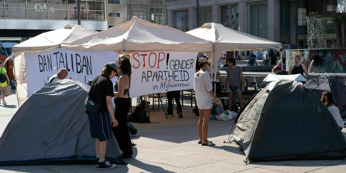 Mit einem Zeltlager auf dem Alexanderplatz machen Aktivist*innen auf die seit drei Jahren andauernde Taliban-Herrschaft in Afghanistan aufmerksam.