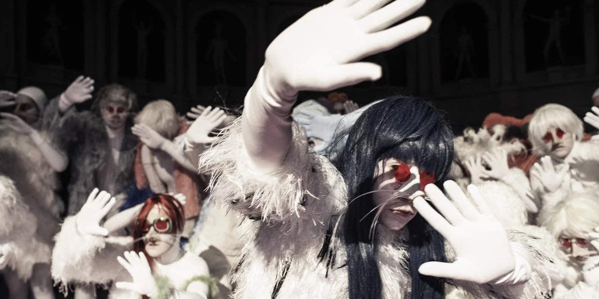 Vor allem aber: Keine Menschen hat man dabei vor sich, sondern rattenhafte Wesen mit überdimensionierten Perücken, die durch kleine Sonnenbrillen blinzeln – die düstere Geschichte von Unrecht und Schuld, Rache und Schlächterei und schließlich vom Untergang der Tyrannis und der Geburt der jungen Demokratie erzählt Mondtag als Groteske.