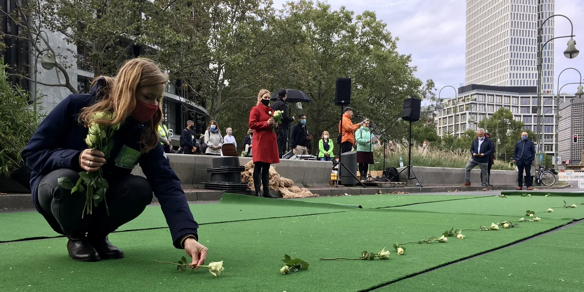 Zum Auftakt verlasen AktivistInnen die Namen der 31 Menschen, die allein in diesem Jahr bereits als ungeschützte VerkehrsteilnehmerInnen – zu Fuß oder auf dem Fahrrad – auf Berlins Straßen gestorben sind. Die meisten von ihnen wurden von Lastwagen, Bussen oder Pkws an Kreuzungen überrollt. Für jedeN ToteN wurde eine weiße Rose abgelegt. „Das Leben im Straßenverkehr zu verlieren ist kein gottgegebenes Schicksal“, kommentierte Stefan Gammelien von Changing Cities die Aktion, „wir können das verhindern.“ Städte wie Helsinki und Oslo hätten es geschafft, die Zahl der Verkehrstoten auf Null zu senken, auch in Berlin sei das möglich.