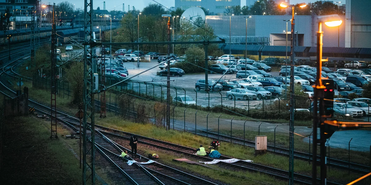 Als die Nachtschicht das Werk verlässt, sind die Aktivist*innen bereits dabei, sich an die Werksschienen zu ketten. Kurz nach sechs Uhr früh am Montagmorgen haben sie die Gleise des Mercedeswerks in Bremen betreten. Ihr Ziel ist es, den Abtransport von Autos zu blockieren. Ihre Hände sind an Ketten befestigt, die durch betonverkleidete Rohre unter den Schienen gezogen wurden. So berichtet es die Pressesprecherin der Aktion, Karla Pfeiffer.