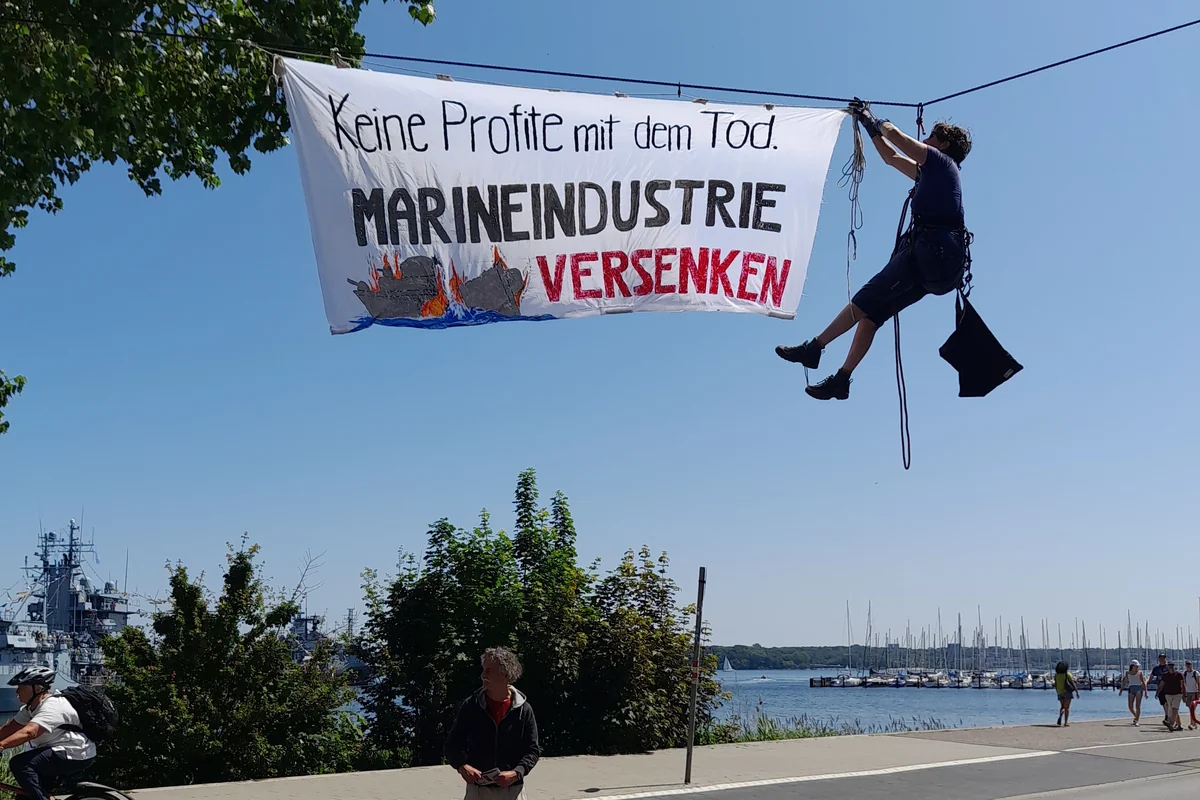 Kopfüber hängt eine Aktivistin in den Ästen einer Linde und hält ein Plakat, das ein zerbrochenes Gewehr zeigt. Daneben flattert ein Transparent: „Organisiert euch gegen Klimakrise und Aufrüstung“ steht darauf. Die Frau ist Teil einer Protestaktion der Gruppe „No Peace. No Climate Justice“. Sie und ihre Mitstreiter:innen, die in einem zweiten Baum ausharren, wollen auf den Krieg als Klima-Killer hinweisen und gegen das „Open Ship“ im Marinestützpunkt Kiel protestieren.