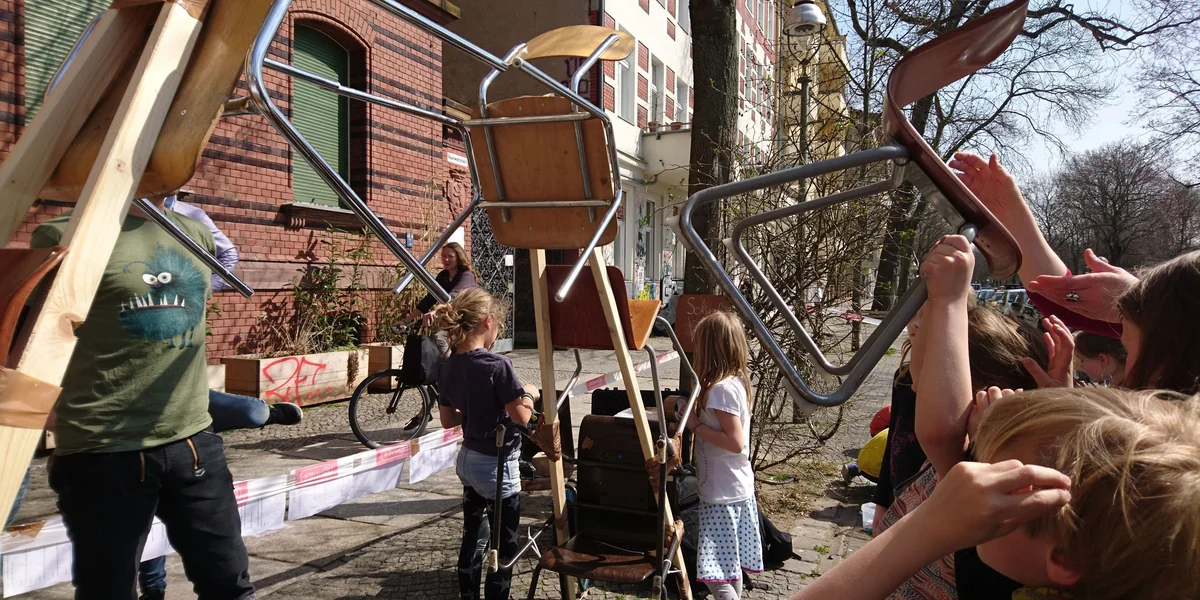 Stühle stapeln auf dem Radweg: Im Kreuzberger Wrangelkiez nehmen sich Schüler mit einer Installation den Raum, der ihnen verloren geht.