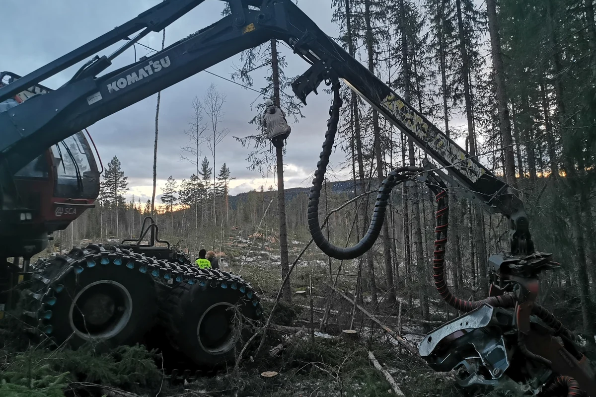 „Sie haben mich aufgefordert, herunterzukommen und anderswo zu protestieren“, erzählt Jakob, nachdem die Beamten durch Matsch, Schneereste und über Baumstämme zu ihm gestakst waren, um mit ihm zu reden. Er bleibt sitzen dort oben, mit Aussicht auf großes Waldpanorama. Die Forstmaschine unter ihm kann einen Wald in kürzester Zeit in eine Fläche voller gestapelter Baumstämme zerlegen. Jetzt steht sie still. Links von ihr die getane Arbeit: Bäume am Boden. Rechts stehen sie noch. Sie sind unterschiedlich groß, also unterschiedlich alt – anders als in den plantagenartigen Wäldern, die auf einen Kahlschlag folgen. Von den Ästen hängen Flechten: Rentierfutter.