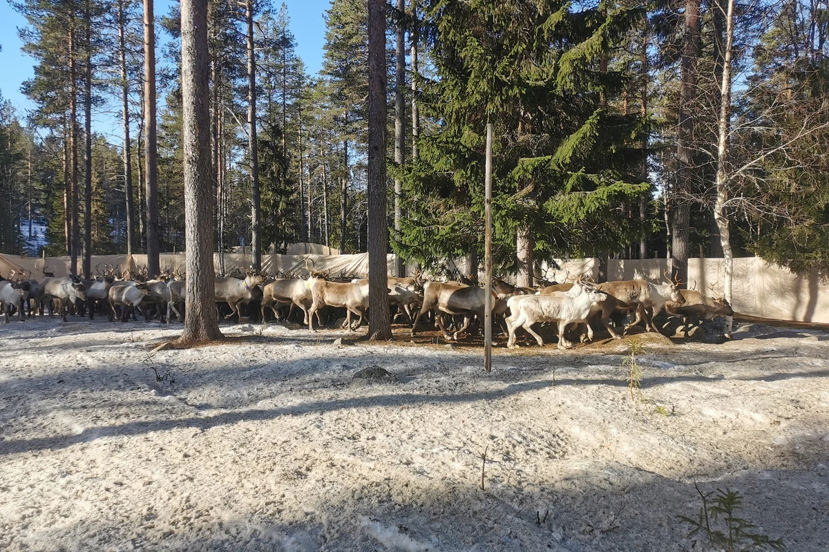 In der Märzmorgensonne haben er, seine Familie und drei befreundete Freiwillige im Wald ein temporäres Gehege aufgebaut, das in einer Art Gangway mündet. Hier werden an diesem Samstag die ersten 400 Rentiere nach Norden in Richtung Sommerweide geschickt – von den Wäldern in der Provinz Västernorrland nach Jämtland, in die Berge nahe der norwegischen Grenze. Die Zeiten, in denen eine Herde die 250 Kilometer wandern konnte, sind lange vorbei.