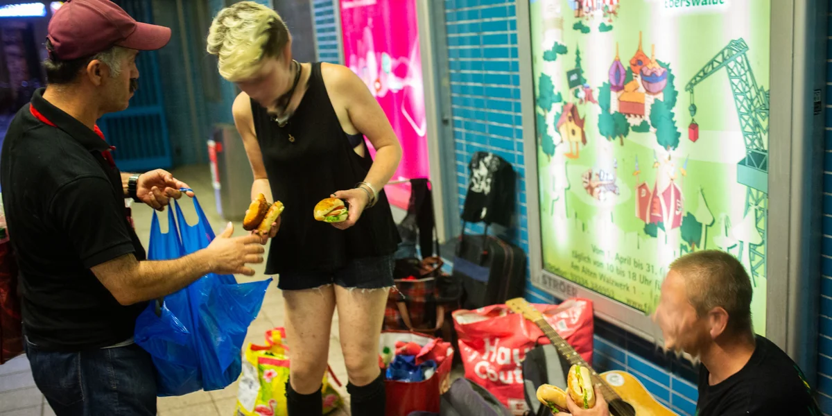 50 yaşlarında bir adam, elinde az önce bir fırından aldığı artık ekmekler ve sandviçlerle kalabalığa yaklaşıyor. Türkiyeli teyzeler, günlük bir ritüelin parçasıymışçasına kabul ediyorlar ekmekleri. Bir yabancıdan gelen bu ikram DJ'leri ise başta biraz tedirgin ediyor. Aralarından biri torbadan küçük bir poğaça almakla yetiniyor. Evsizler ise aralarındaki tartışmayı bırakıp ayağa kalkıyorlar, torbadaki yiyeceklerden diledikleri kadar alıyorlar. Adama verilen kısa bir selamın ardından herkes sandviçlerini yemeğe başlıyor.