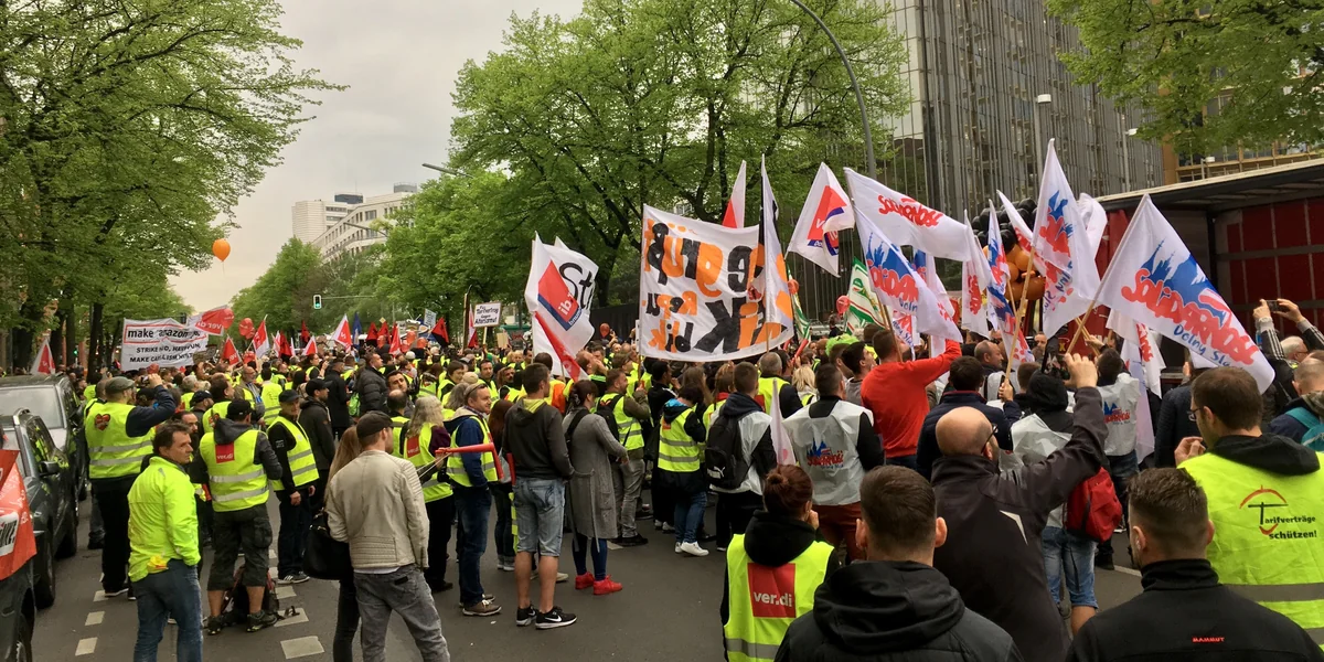 Doch gerade Angestellte des Versandunternehmens machen auf der Kundgebung ihren Widerspruch gegen die Geschäftspraxis Amazons deutlich. Unübersehbar sind die Warnwesten der Gewerkschaft Verdi, genauso die Fahnen der polnischen Solidarnosc und mehrerer internationaler Basisgewerkschaften, die zu den Protesten aufgerufen haben.