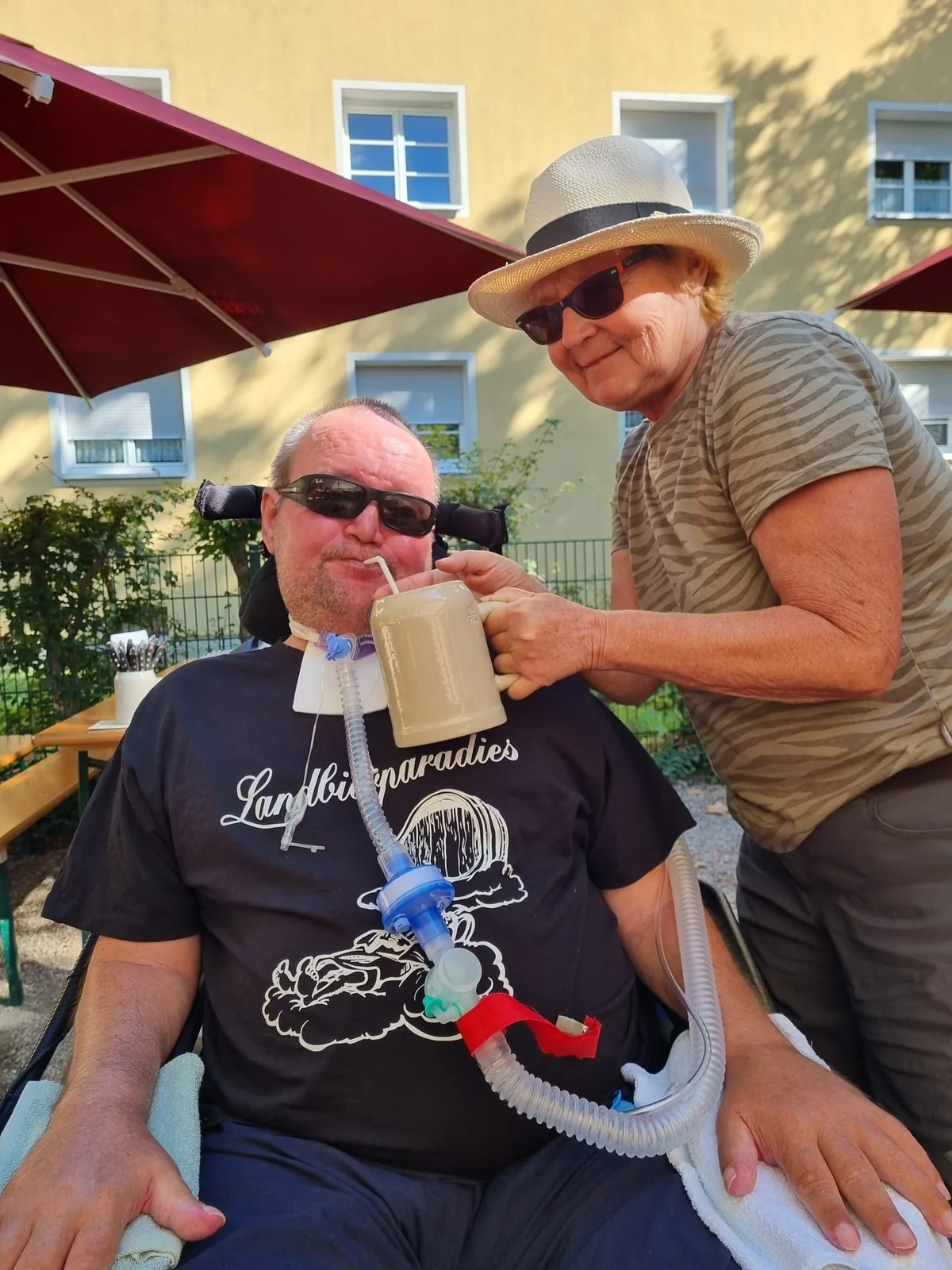 Im Flur steht Webers Elektrorollstuhl und wartet auf den nächsten Ausflug ins Landbierparadies. Auch ihn steuert er mit den Augen, wenn er bei schönem Wetter durch die Gegend düst. Man habe ihm gesagt, er sei ein Naturtalent, spricht die Frauenstimme aus seinem Sprachcomputer. Per WhatsApp schickt Weber später ein Video aus dem vergangenen Sommer. Er trägt eine spezielle Steuerbrille und kurze Hosen. Er sieht glücklich aus.