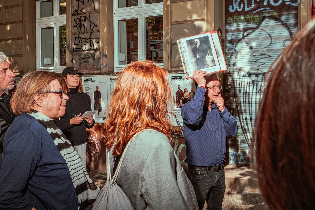 Ein gelbes, von Efeu bewachsenes Haus in einem Kreuzberger Hinterhof – ganz in Schwarz steht der Theaterschauspieler Helmut Mooshammer vor der Fassade und liest: „Ein Geist kommt über die Menschen.“ Und tatsächlich – das gute Dutzend, das sich zur Stadtführung versammelt hat, hört zu wie gebannt.