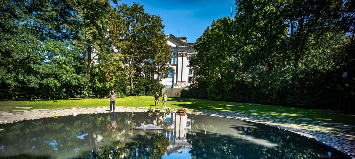 Das Denkmal befindet sich in einem unscheinbaren Winkel am äußersten Rand des Berliner Tiergartens. Tausende Touristen strömen dort auf dem Weg vom Brandenburger Tor zum Reichstag täglich vorbei. Sie können es leicht übersehen, denn nur ein schmales Tor in einer Wand aus milchglasfarbenen Glasplatten führt auf das Gelände. Dort, von gläsernen Informationstafeln umringt, befindet sich ein runder Brunnen und in dessen Mitte ein dreieckiger Stein, auf dem eine frische Blume liegt. Das Dreieck soll an den Häftlings-Winkel erinnern, den Sinti und Roma in den deutschen Konzentrationslagern tragen mussten. Die Blume auf dem Stein wird regelmäßig erneuert – als „Symbol des Lebens, der Trauer und der Erinnerung“, wie der 2021 verstorbene Künstler Dani Karavan vor seinem Tod verfügte.