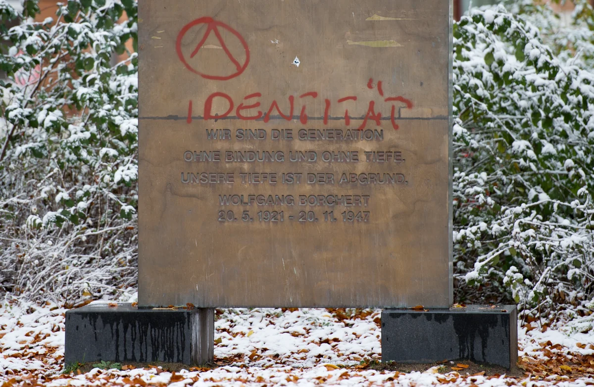 Das Denkmal für den antifaschistischen Schriftsteller Wolfgang Borchert wird mit dem roten Schriftzug „Identität“ beschmiert.