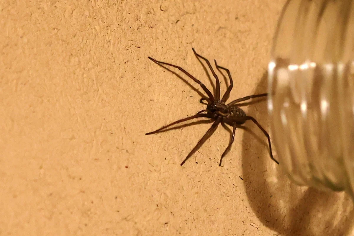 Ich hole ein Trinkglas und ein Stück festes Papier, platziere einen Stuhl unterhalb der Spinne in der Ecke und steige hinauf. Mit der rechten Hand stülpe ich das Glas über sie, mit der linken schiebe ich vorsichtig die Pappe zwischen Wand und Glas. So setze ich die Spinne fest. Den Fang in Händen steige ich, ohne mich irgendwo festhalten zu können, zurück zum Boden. Geschafft! Heil auf meinen beiden Beinen wieder angekommen, schaue ich genauer hin.