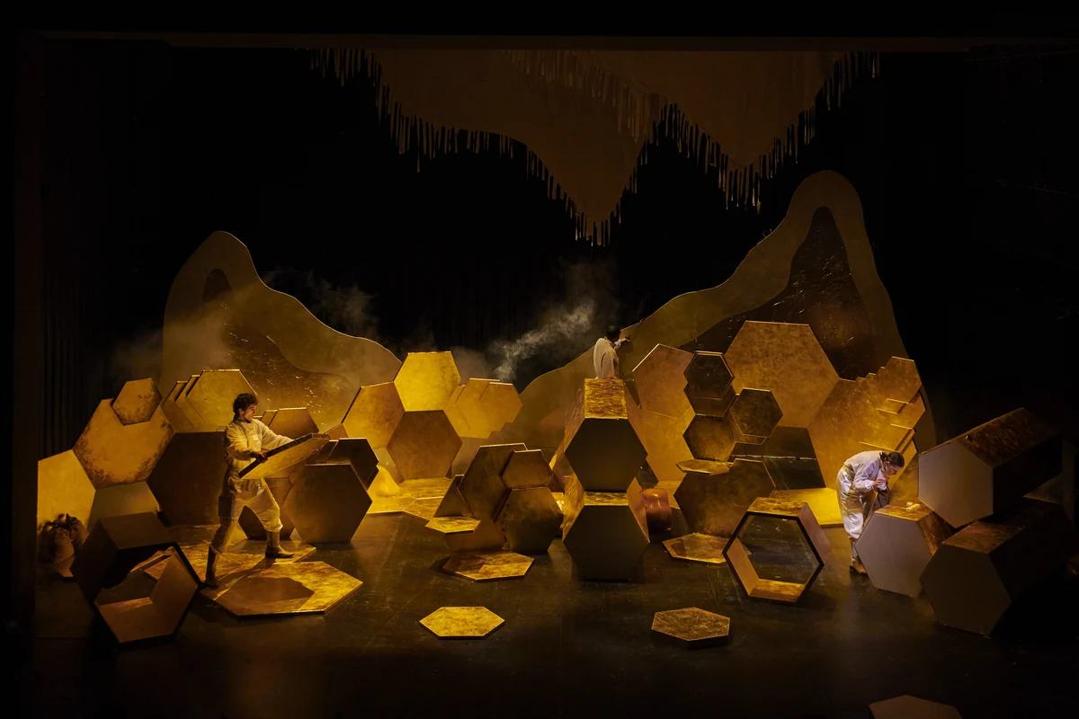 In der Braunschweiger Fassung ist es eine sektiererische Wohngemeinschaft, die sich derart eingebunkert hat. Ihr selbst gewähltes Luxusgefängnis wirkt unter triefenden Honigwolken wie ein Mix aus Wabe und Goldsafe (Bühne: Jana Wassong).