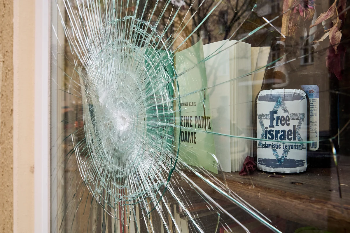 Dafür prangt jetzt erneut ein großes rotes Hamas-Dreieck an der Fassade. Der Pflasterstein war so groß, dass er nicht in eine der Tüten passte, in die die Polizei verdächtige Gegenstände vom Tatort einsammelt, berichtet Andrea Reinhardt am Tag danach. In der Gegend rund um das Bajszel gebe es solche Pflastersteine nicht.