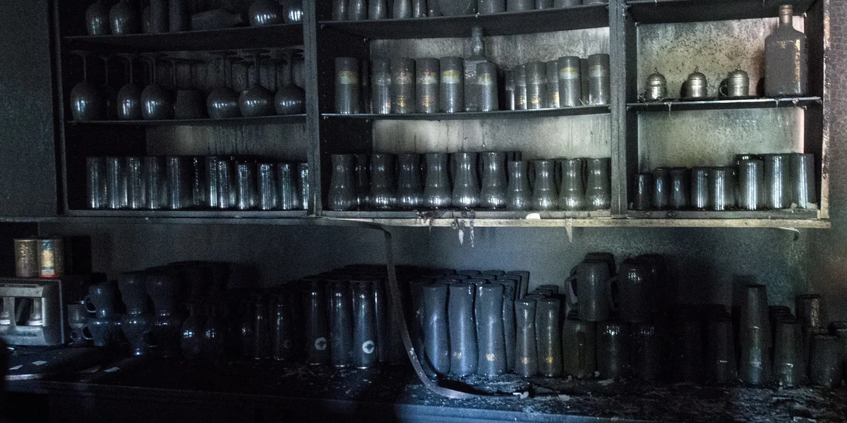 Ali T. läuft durch den Brandschutt, knirschend über Scherben. Vorbei an zerborstenen Scheiben, am verkohlten Tresen, den Stühlen mit den aufgeplatzten Polstern. Die Tische sind rußüberzogen, auch die Gläser und Flaschen in den Regalen, die Wände. Die Küche, die Toiletten: alles schwarz.
