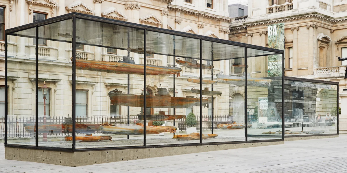 Die Ankunft erfolgt über das Meer, wie es sich gehört als eine Referenz für die britische Nation der Seefahrer. Nicht weit vom Trafalgar Square und dem Waterloo Place entfernt liegt die Royal Academy of Arts in London. Dort beginnt eine große Retrospektive für Anselm Kiefer im weiten Hof mit zwei Vitrinen, die den Seeschlachten der Weltgeschichte gewidmet sind. U-Booten gleich schweben bleierne Hülsen durch das Sonnenlicht oder sind auf den Grund aus gesprungener Erde gesunken.