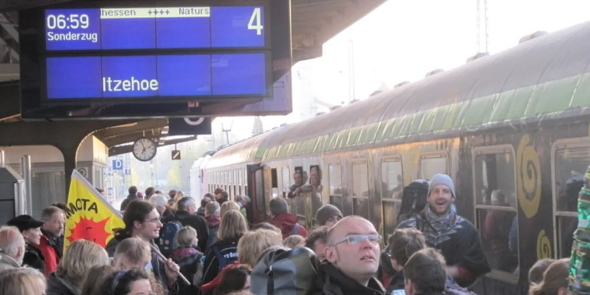 Der Sonderzug aus Kassel, Göttingen und Braunschweig ist in Itzehoe eingetroffen. Während die mitreisende Samba-Band sich aufs Musizieren vorbereitet, fahren die Passagiere mit bereitstehenden Bussen weiter nach Brokdorf.