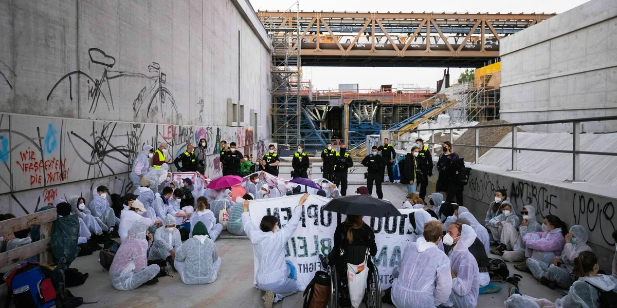 Ihre Personalien wollten die Aktivist*innen, die am Samstag die Autobahnbaustelle der A 100 am Treptower Park blockiert hatten, unter keinen Umständen abgeben. Ihre Ausweise hatten die meisten der etwa 400 Klimaschützer*innen in den weißen Maleranzügen gleich zu Hause gelassen, vor Ort hatten sich viele die Gesichter bemalt oder Fingerkuppen verklebt, um einer Identifizierung durch die Polizei zu entgehen. Schon mehr als fünf Stunden hielten sie das sandige zukünftige Stück Autobahn bei unbarmherzig strahlender Sonne in Beschlag. Doch das Angebot ohne Strafanzeige, aber eben mit Abgabe der Personalien zu gehen, lehnten sie ab.