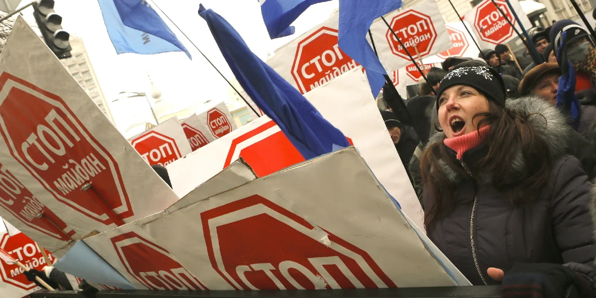 Am Vorabend hatten ukrainische Fernsehkanäle ausführlich über die Ankunft des Sonderzuges aus dem Osten des Landes berichtet, der Janukowitsch-Anhänger nach Kiew brachte, um für den angeschlagenen Präsidenten Unterstützung zu demonstrieren. Bevor es in die Innenstadt ging, wurden die Demonstranten noch mit druckfrischen blauen Fahnen versorgt. Befragt, warum er sich auf den Weg in die Hauptstadt gemacht habe, hatte ein 14 Jahre alter Schüler erklärt, dass er 40 Euro für die Teilnahme an der Reise erhalten habe.