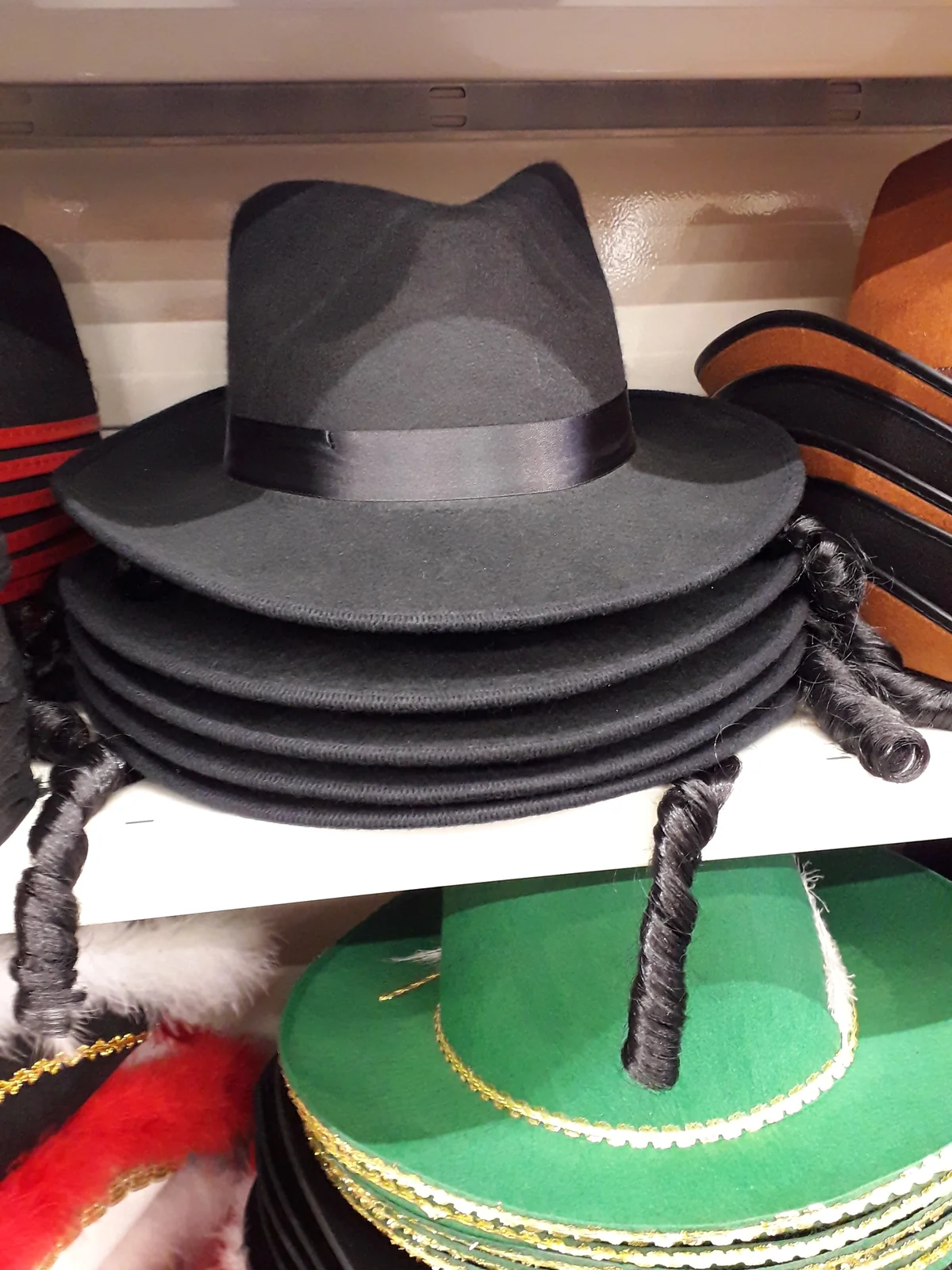 Der Umhang ist inzwischen ausverkauft, sagt die Chefin, die an diesem Mittag an der Kasse steht. Was die anderen Accessoires betrifft, bestreitet sie, dass diese spezifisch jüdisch sein sollten. „Die Nase ist eine Hexennase“, weist sie auf eine schrumpelige Maske in Plastikverpackung. „Der Umhang kann auch für Schornsteinfeger oder Zorro gebraucht werden. Der Bart für Klabauter und Scheichs.“ In den hinteren Regalreihen zwischen allerlei anderen Kopfbedeckungen findet sich schließlich auch das Modell, das ihr Mann auf dem Foto trug. Fünf Stück sind noch übrig, Material: 100 Prozent Polyester, made in China. „Hoed hat sombrero“, so das Etikett lapidar. Seitlich baumeln zwei dünne Schläfenlocken-Attrappen.