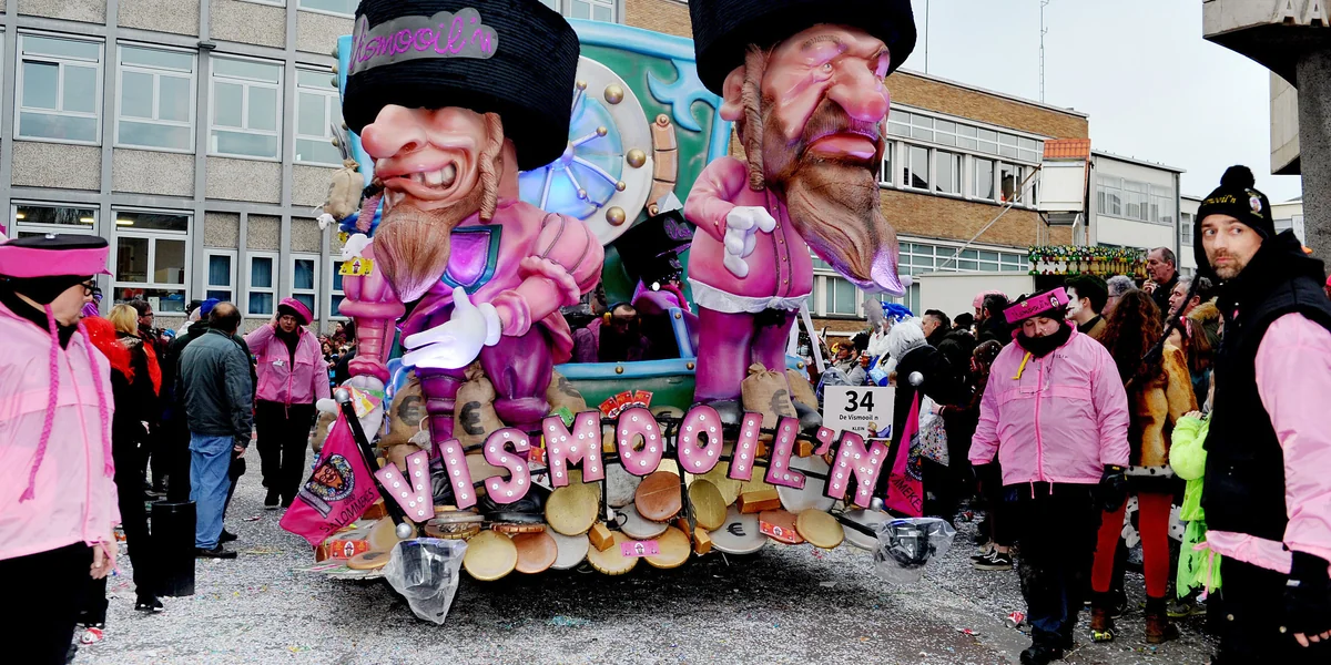 März 2019, Karnevalssonntag, der große Umzug, Höhepunkt der närrischen Umtriebe. Auf einem Wagen der Gruppe Vismooil’n, was übersetzt so viel wie Fischmäuler bedeutet, sitzen zwei riesige Puppen mit Hakennasen, schwarzen Hüten und Schläfenlocken. Auf der Schulter der einen hockt eine Ratte, zu beider Füßen liegen Geldsäcke. Dahinter tanzen die ähnlich verkleideten Mitglieder der Gruppe auf Geldkisten zu den landesweit beliebten Billig-Beats, während aus den Lautsprechern aufgekratzte „sjalommekes“- Rufe klingen – ein flämischer Dialektausdruck, der sich mit „Schalömchen“ übersetzen lässt.