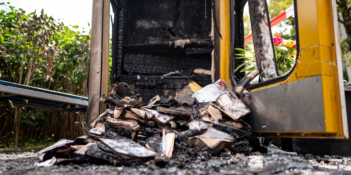 Am frühen Samstagmorgen gegen fünf Uhr soll ein Mann eine Kiste in die Bücherbox gestellt und sie angezündet haben. Zwei Augenzeugen meldeten ihre Beobachtungen in einer Bäckerei. Der polizeiliche Staatsschutz übernahm die Ermittlungen. Die Feuerwehr konnte nur noch den Brand löschen, nicht jedoch die wertvollen Erinnerungsstücke in der Box retten.