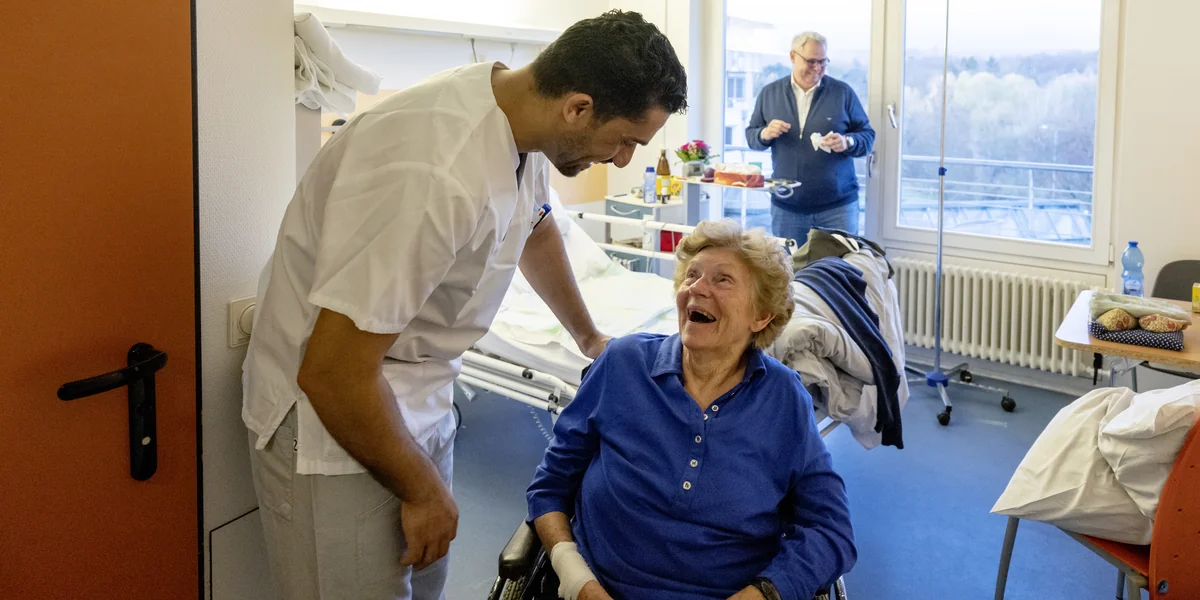 Ben Abdallah arbeitet in einem privaten Reha-Krankenhaus in Wiesbaden. Früh-, Spät- und Nachtschicht im Wechsel. Viele Schlaganfall-Patienten und alte Menschen mit partiellen Lähmungen, denen der Pfleger helfen muss, sich im Bett umzudrehen, damit sie keine Druckgeschwüre bekommen. Waschen, Unterstützung beim Essen, Medizin zuteilen gehören ebenfalls zu seinen Aufgaben. Für acht bis zehn Personen sei er pro Schicht zuständig, sagt er, harte Arbeit.